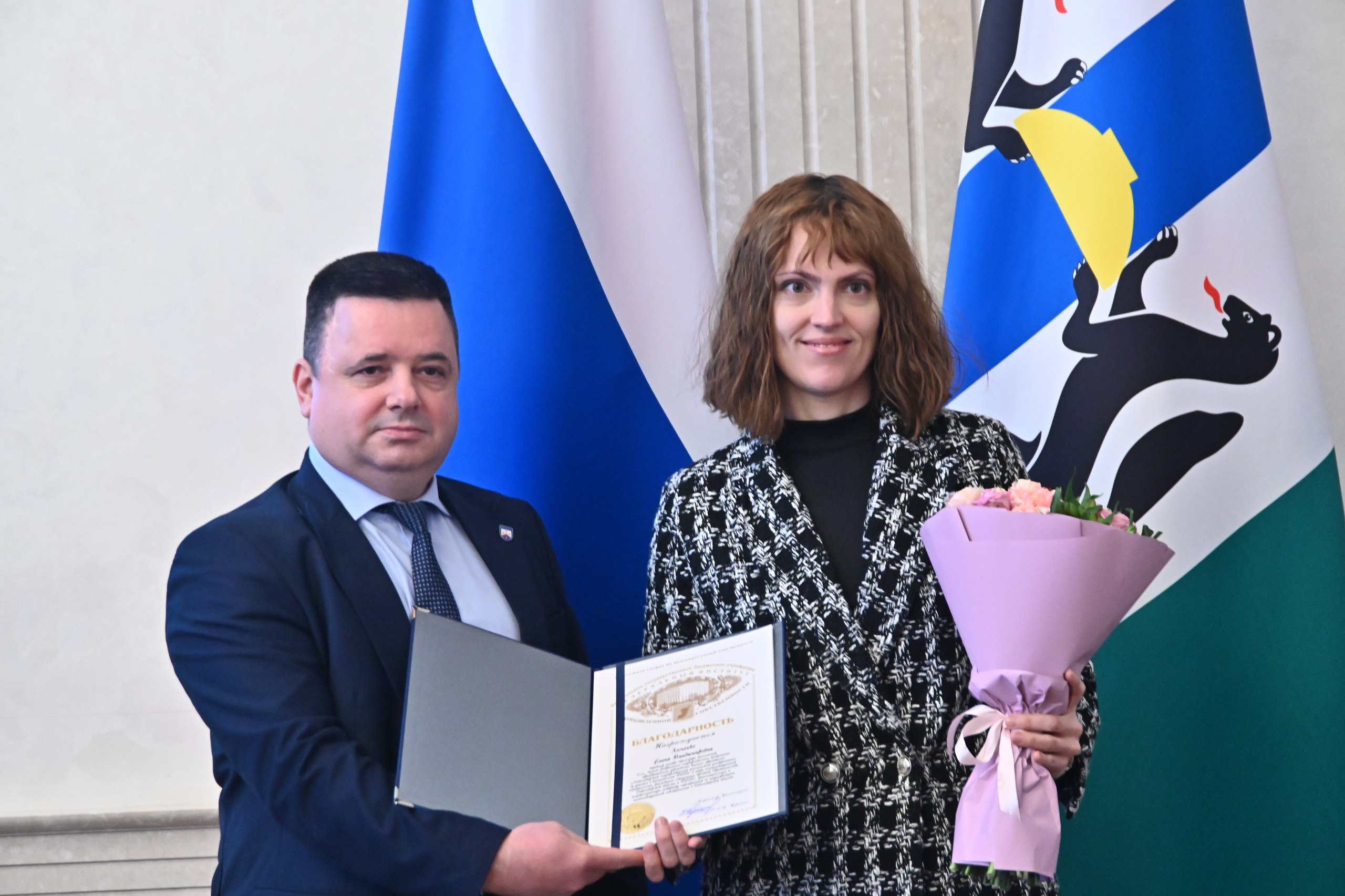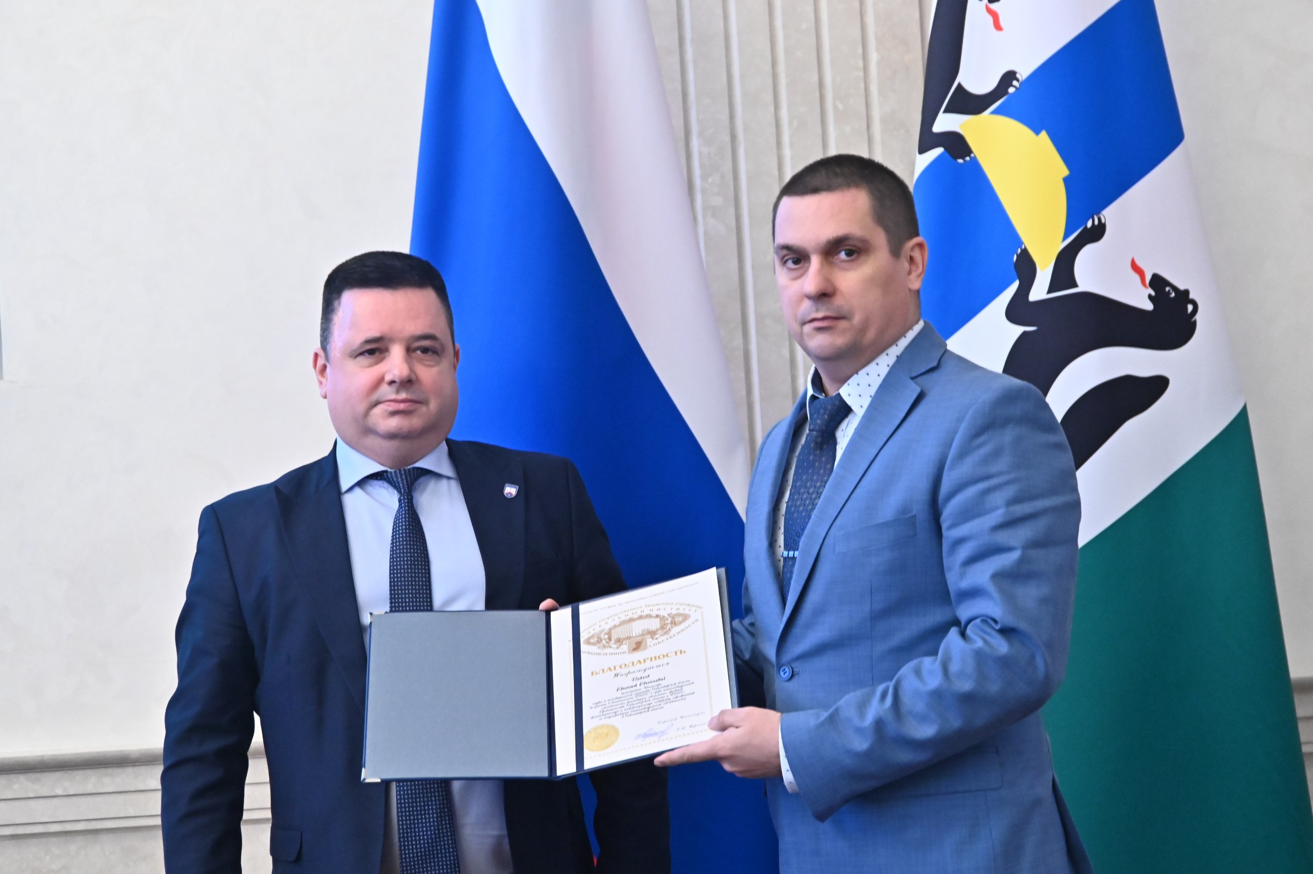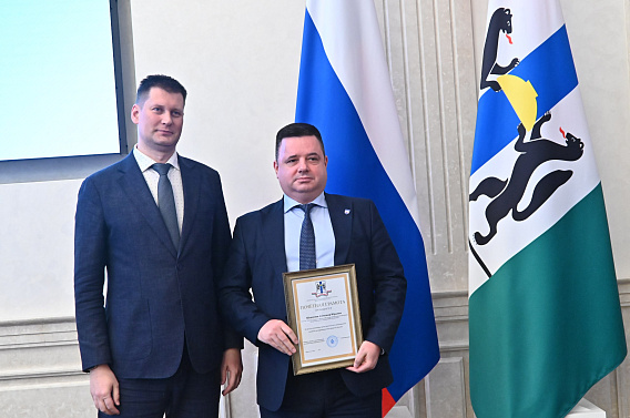 Министр науки и инновационной политики Новосибирской области Вадим Васильев вручил Почетную грамоту начальнику Сибирского центра ФИПС Александру Шлапунову за заслуги в реализации научно-технической и инновационной политики на территории Новосибирской области.